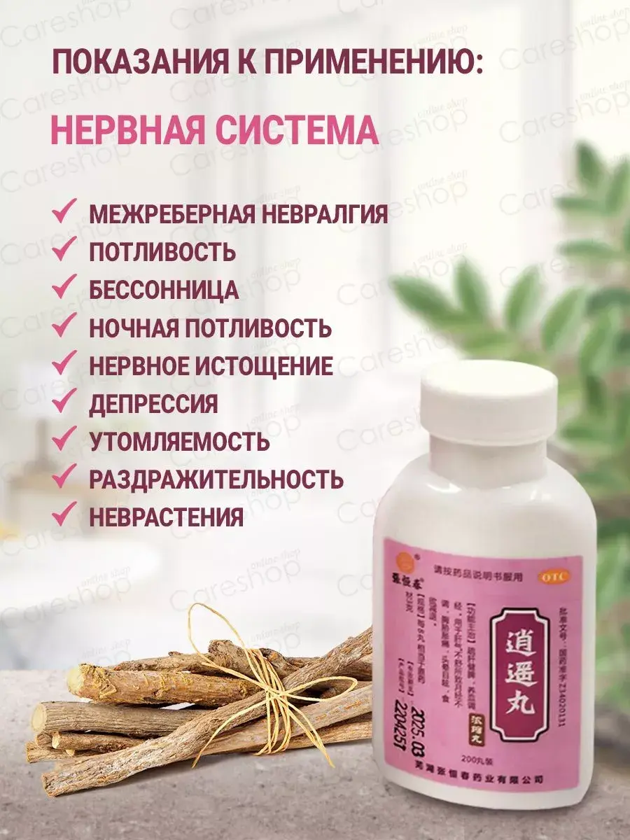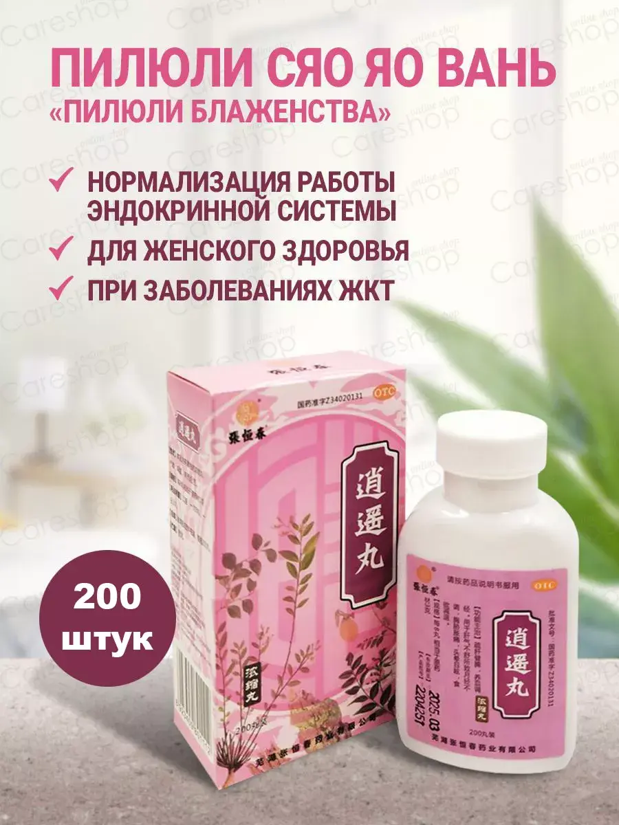Пилюли блаженства "Сяо Яо Вань" (XiaoYaoWan) или как их еще называют врачи «беззаботные шарики» избавляют организм от последствий угнетающего влияния негативных эмоций. Это уникальное средство профилактики психосоматических заболеваний. Пилюли, убирая застой в печени, снимают нервное напряжение, беспокойство. Устраняют ощущение заложенности в груди на фоне психоэмоционального напряжения, потливость при незначительной физической нагрузке, а также ночную потливость. Эффективны при бессоннице. Улучшают работу печени, желчного пузыря, кроветворную функцию селезенки нормализуют процессы синтеза ферментов и пищеварительных соков. Это лекарство называют «лучший рецепт № 1 от болезней печени» в Китае. Пилюли блаженства "Сяо Яо Вань" (XiaoYaoWan) являются высокоэффективным часто используемым средством для лечения болезни застоя Ци, нарушений менструального цикла, образования уплотнений в молочных железах, развивающихся вследствие застоя Ци Печени, пустоты Крови и слабости Селезенки. Действие с точки зрения ТКМ: Успокаивает Печень. Убирает Застой Ци Печени и двигает Ци. Укрепляет Селезенку. Питает Кровь. Используется в случаях, когда имеется Застой Ци Печени на фоне Пустоты Инь и Крови Печени, и когда Печень чрезмерно влияет на Селезенку. Так же пилюли блаженства являются высокоэффективным часто используемым средством для лечения женских болезней, таких как мастопатия, миома матки, нарушения менструального цикла, фиброаденоматоз молочных желёз, кисты яичников, хроническое воспаление органов малого таза, боли в области поясницы во время менструации, климактерический синдром, боли в груди. Показания к применению: хронический гастрит, расстройство кишечника на фоне стрессов неврастения, истерия, межрёберная невралгия, снижение остроты зрения профилактика и при симптомах мастопатии, усиливающихся при нервном возбуждении (принимать за 10 дней до менструации). профилактика и лечение язвенной болезни желудка и 12-перстной кишки (когда симптомы усиливаются на фоне стрессов).